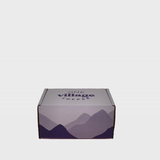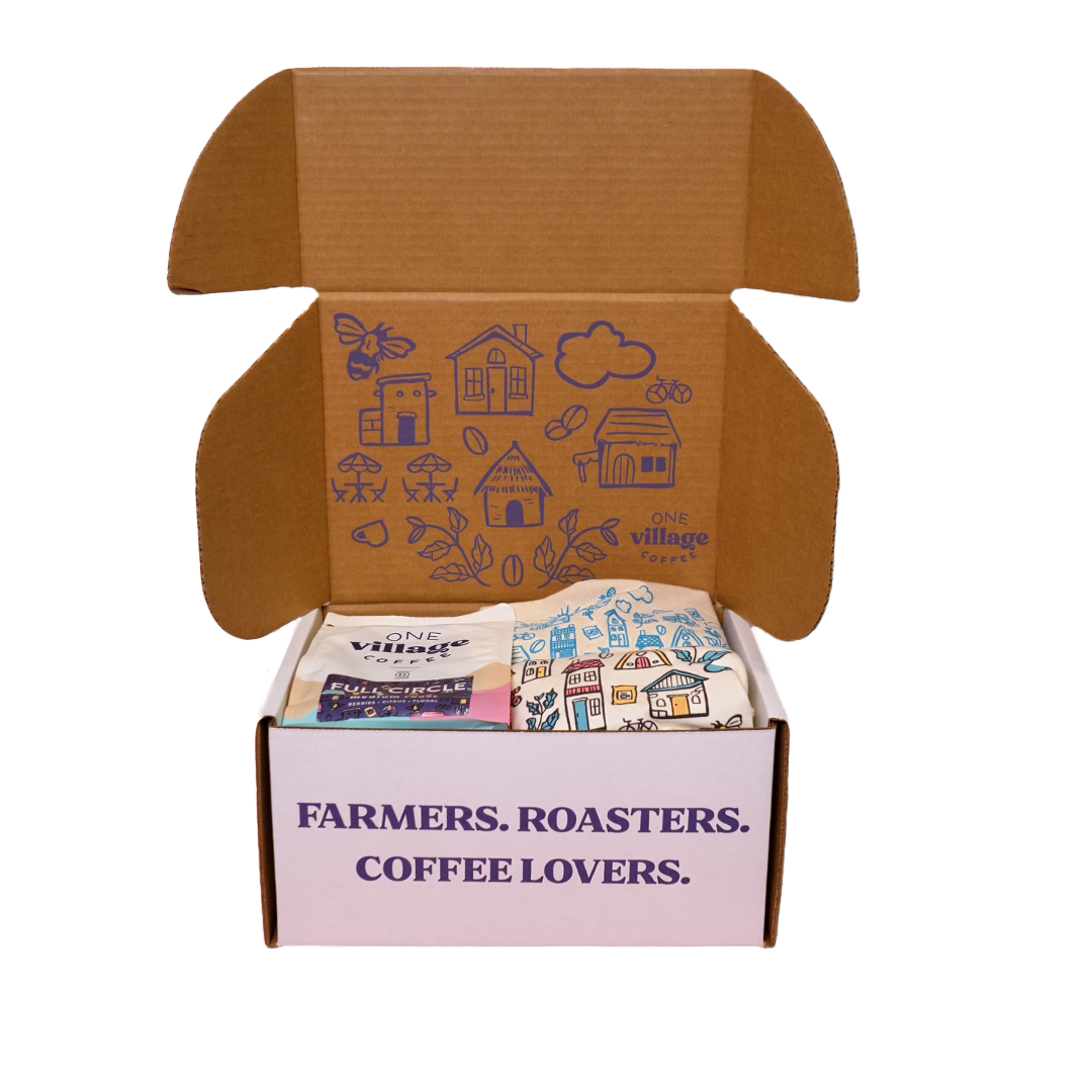 The essentials, all in one box. This gift includes a 12 ounce bag of Full Circle - a medium roast African coffee with berry, citrus, and floral notes. Pair it with a OVC Full Circle bag, and a super-soft One Village Coffee tee. Great coffee, great style—full circle.