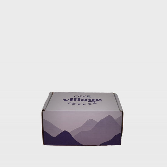 This gift box includes one 12-ounce bag of Villager (light roast) and one 12-ounce bag of Artist (medium roast), plus an OVC stainless steel insulated tumbler to enjoy your coffee on the go!